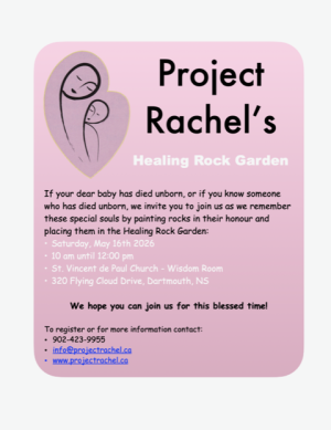 Project Rachel paints rocks yearly and places them in the Healing Rock Garden at St. Vincent de Paul Church in memoriam of those who have been lot to avortion or miscarriage. This event is open to all.